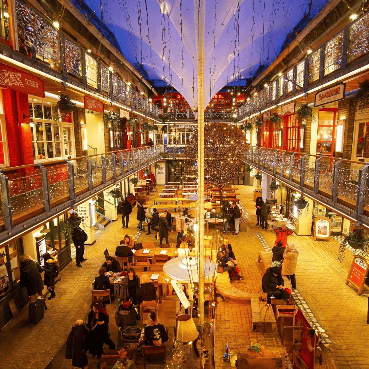 Three level courtyard off Carnaby Street packed with independent restaurants and bars, from tacos and ramen to Filipino plates and cocktails, all around a covered open air square.